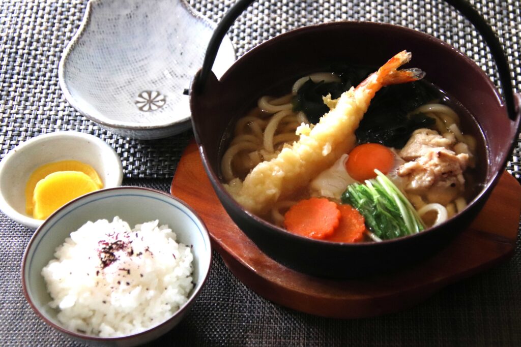 旨みが染み込んだお出汁に、コシのあるうどん、そして揚げたての海老天をのせた贅沢な鍋焼きうどん。